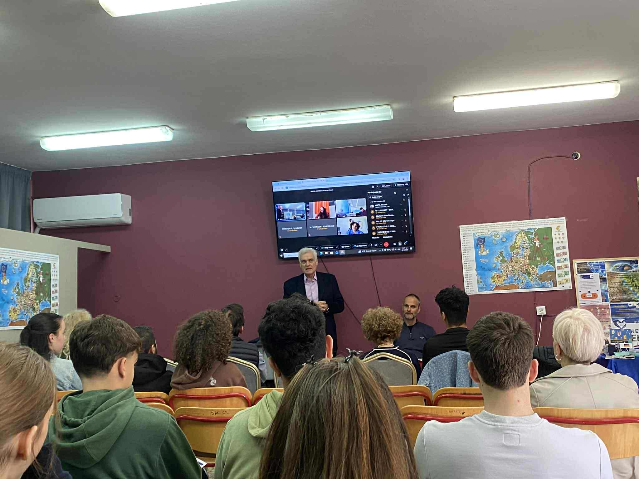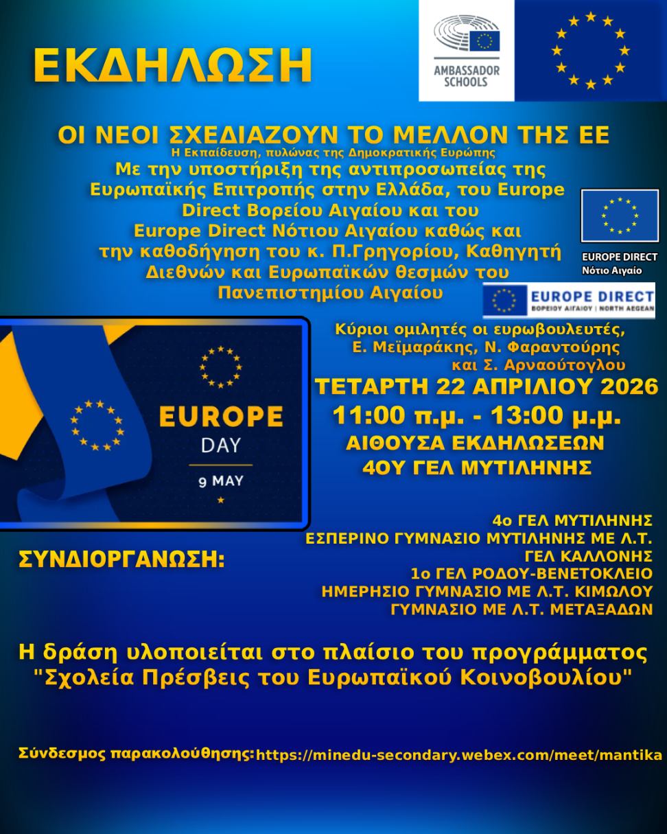 Το επιστημονικό προσωπικό του Europe Direct Βορείου Αιγαίου πραγματοποιεί συχνές επισκέψεις σε σχολεία, όπου ενημερώνει μαθητές, μαθήτριες και εκπαιδευτικούς για ζητήματα που αφορούν στην Ευρωπαϊκή Ένωση και τις πολιτικές της.
