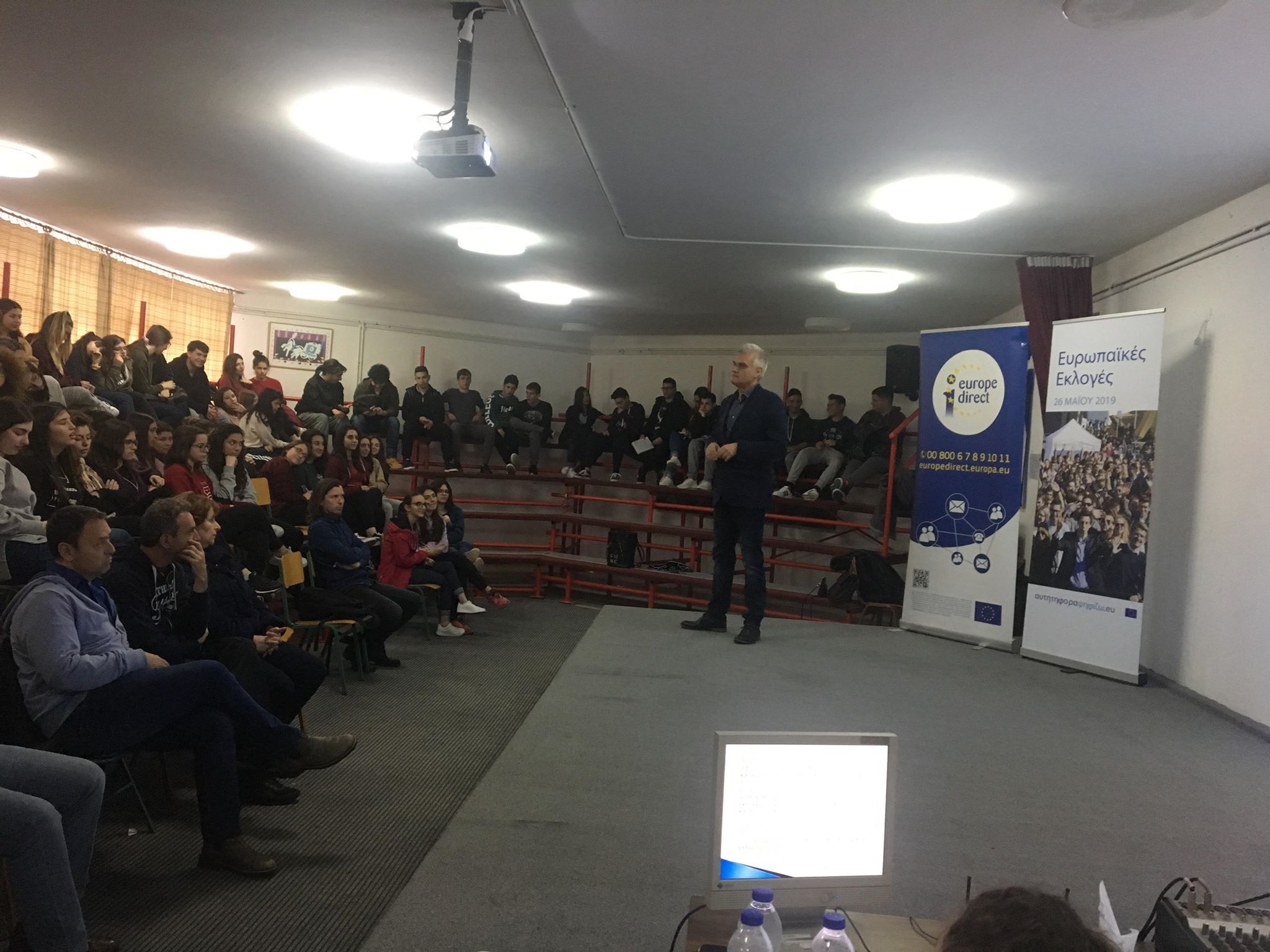 Το Κέντρο Ευρωπαϊκής Πληροφόρησης, με αφορμή γεννωμένης των Ευρωεκλογών που θα διεξαχθούν στις 26 Μάιου, πραγματοποίησε την Τρίτη, 9 Απριλίου σχολική επίσκεψη στο 5ο Γενικό Λύκειο την οποία παρακολούθησαν οι μαθητές της Α΄ και Β΄ Λυκείου.
