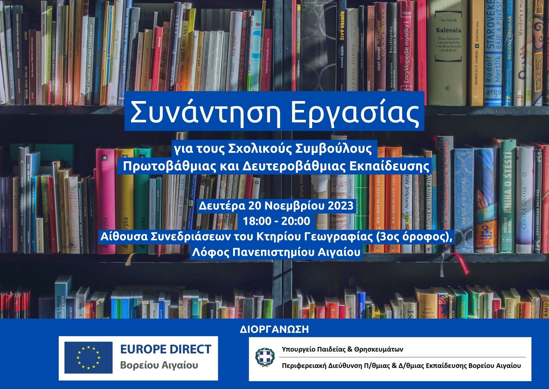 Στο πλαίσιο συνεργασίας του Europe Direct Βορείου Αιγαίου με την Περιφερειακή Διεύθυνση Πρωτοβάθμιας και Δευτεροβάθμιας Εκπαίδευσης Βορείου Αιγαίου, πραγματοποιήθηκε Συνάντηση Εργασίας η οποία απευθυνόταν στους Σχολικούς Συμβούλους και Εκπαιδευτικούς της Πρωτοβάθμιας και Δευτεροβάθμιας Εκπαίδευσης του Βορείου Αιγαίου, τη Δευτέρα 20 Νοεμβρίου 2023 και ώρα 18:00 έως 20:00 στην Αίθουσα Συνεδριάσεων του Κτηρίου Γεωγραφίας (3ος όροφος) του Πανεπιστημίου Αιγαίου (Λόφος Πανεπιστημίου, Μυτιλήνη)