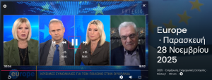 Την Παρασκευή 28 Νοεμβρίου 2025 προβλήθηκε στην ERT News η ιδιαίτερα ενδιαφέρουσα εκπομπή «Europe» με τη δημοσιογράφο Εύα Μπούρα. Στο στούντιο φιλοξενήθηκε ο Επικεφαλής του Europe Direct Βορείου Αιγαίου, Καθηγητής Πάνος Γρηγορίου, για μια συζήτηση που ανέδειξε τις τρέχουσες εξελίξεις στην ευρωπαϊκή πραγματικότητα.